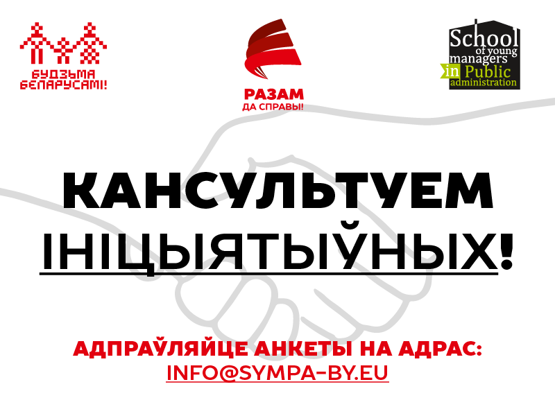Грамадская культурніцкая кампанія “Будзьма беларусамі” і Школа маладых менеджараў публічнага адміністравання SYMPA ў межах рэгіянальнай праграмы “Разам да справы” запрашаюць мясцовых актывістаў атрымаць практычныя кансультацыі па тым, як дасягнуць выніку і зрабіць сваю грамадскую ініцыятыву паспяховай.