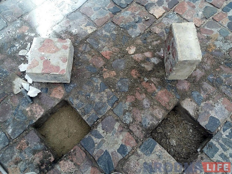 Рабочыя “Рэмаўтадора” мяняюць разбітыя кубікі бруку на больш новыя, зробленыя яшчэ ў савецкі час.