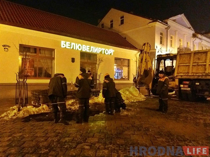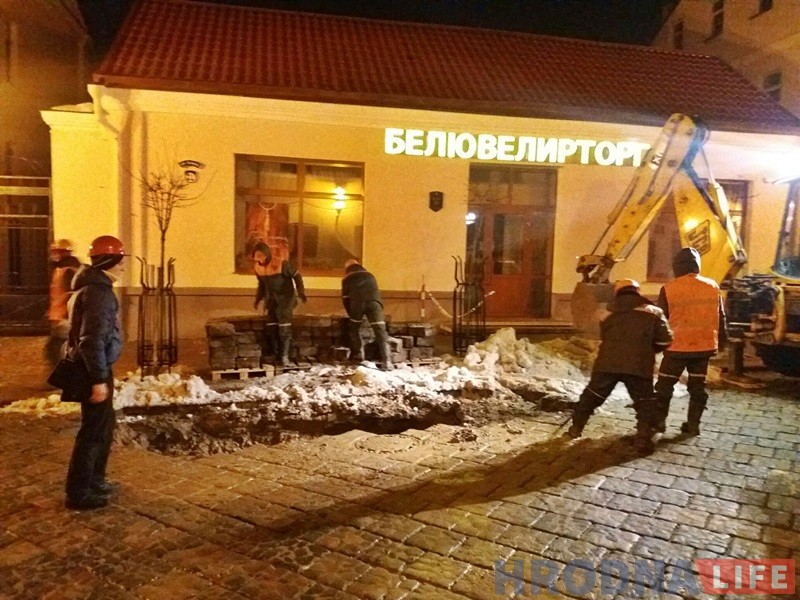 На наступны дзень на вуліцы ўжо працуюць супрацоўнікі Рэмаўтадора – укладваюць брукаванку. Але нават яны кажуць, што праблема з трубамі там сур’ёзная і што Водаконал неўзабаве вернецца на вулiцу.