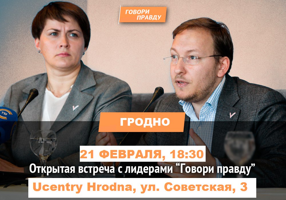 21 лютага ў Цэнтры гарадскога жыцця (вул. Савецкая, 3, галерэя “Крыга”) адбудзецца сустрэча з кіраўніцтвам кампаніі “Гавары Праўду”. Да жыхароў горада над Нёманам завітаюць Таццяна Караткевіч і Андрэй Дзмітрыеў. Яны наведаюць Гродна ў межах паездак па рэгіянальных цэнтрах.