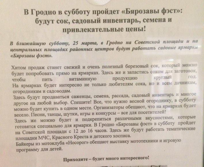 Адначасова зявіліся і аб’явы адб правядзенні ў Гродне райцэнтрах кірмашоў “Бярозавы фэст”. На фестывалі анансуюць продаж бярозавіку, садовага інвентара, саджанцаў і рассады. У Гродне кірмаш будзе праходзіць адначасова з дазволеным мітынгам, прысвечаным Дню Волі.