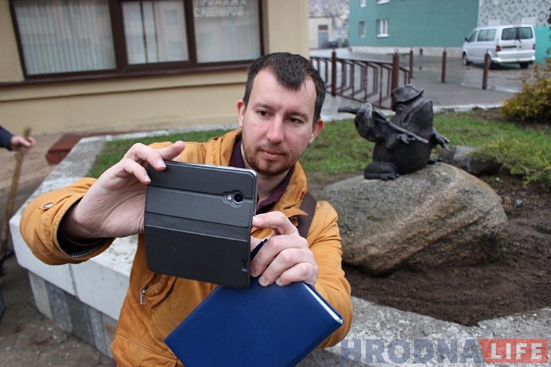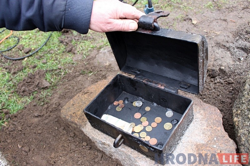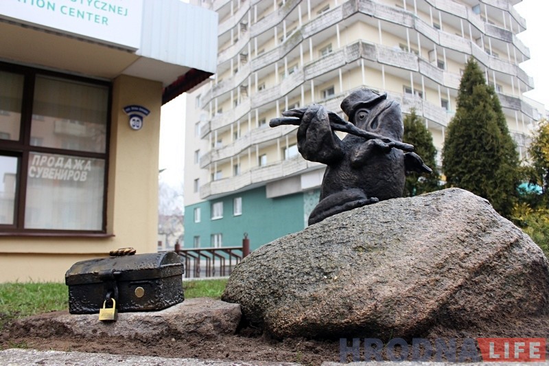Да скульптуры мы дадалі куфэрак. Калі мы дэмантавалі скульптуру, то пад ёй знайшлі шмат грошай: і папяровых, і манет. I ўжо тады ўзнікла ідэя, каб гараджане і госці кідалі грошы ў адмысловы куфэрак”.