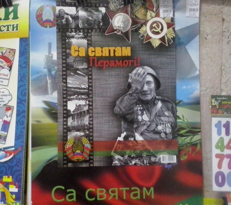 Плакат «Са святам Перамогі!», які прадаецца ў беларускіх кнігарнях, змяшчае фота ветэрана, які сімпатызуе рускім фашыстам, піша “Новы час”.
