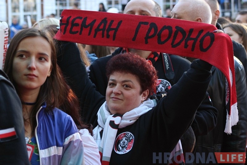 Свой жа падарунак “Нёману” зрабіў і гродзенскі фан-клуб. Фанаты ўручылі камандзе самы вялікі вымпел ў гісторыі беларускага хакея – гульцы і галоўны трэнер падзякавалі фан-клуб за такі падарунак і паабяцалі, што магчыма ў будучым ён будзе вісець у распранальні каманды.