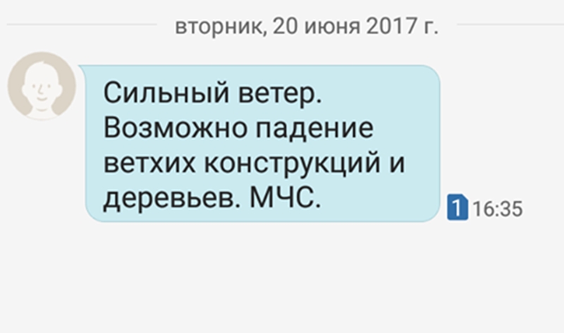 У пасляабедзенны час у аўторак 20 чэрвеня гродзенцам сталі прыходзіць смс-паведамленні з папярэджаннем ад МНС аб неспрыяльных умовах надвор’я: “Моцны вецер. Магчыма падзенне старых канструкцый і дрэў. МНС”. Падобнае папярэджанне было абвешчана і па радыё.