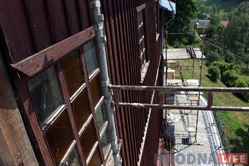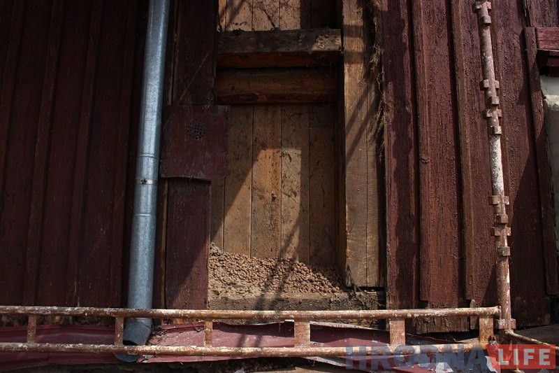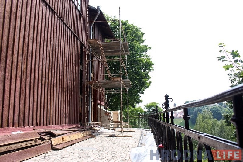 Супрацоўнікі Гроднажылбуд ужо два дні здымаюць частку абшыўкі Каложскай царквы, каб спецыялісты і архітэктары змаглі агледзець стан драўлянай сцяны. Яна мае патрэбу ў рамонце.