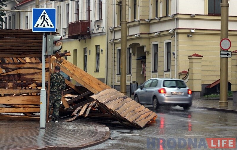 “У той момант, як перад навальніцай падняўся моцны вецер, я паварочваў на светлафоры да Фарнага касцёла і стаў  удзельнікам выпадку, які мог скончыцца сумна, – распавядае Антон. – Каля касцёла стаяла драўляная агароджа, і ад парыва ветру яна пачала падаць. У той момант я ехаў у левай паласе і за долю секунды, пераканаўшыся, што нікога ў правай паласе няма, пачаў перабудоўвацца і паскарацца. У той самы момант з пад плота выбегла на дарогу жанчына, прама мне пад колы. Адлегласць да яе была  каля  5-10 метраў. Я ў той жа момант даў у левую паласу і прытармазіў, тым самым даўшы ёй бяспечна прабегчы, але атрымаў удар ад падзення плота ў левы бок сваёй машыны”.