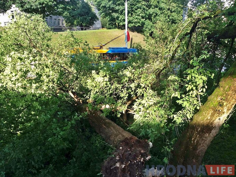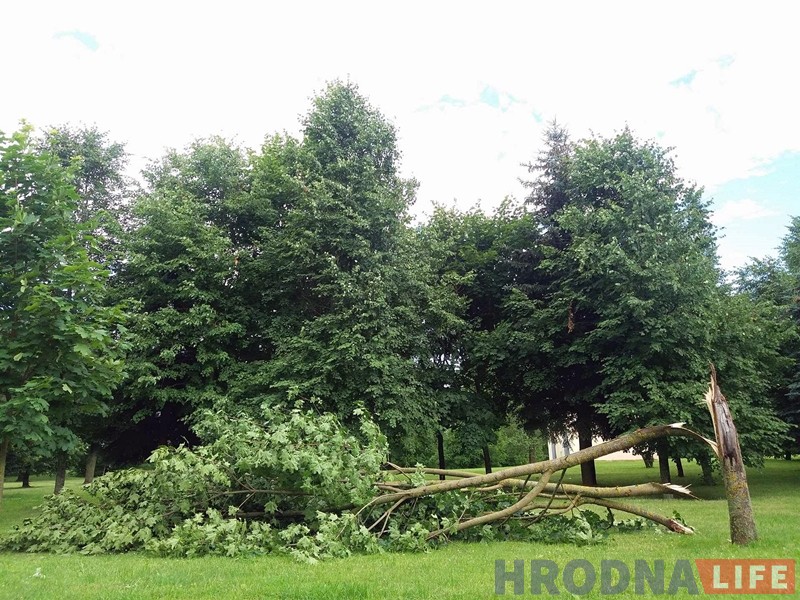 Моцныя дажджы і парывісты вецер да 20 метраў у секунду прайшлі па тэрыторыi Гродна з 15:30 да 16:00. Увечары ў горадзе працавалі супрацоўнікі Зелянбуда: яны прыбіралі паваленыя дрэвы і зламаныя галіны.