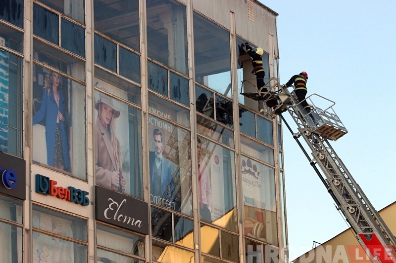 Тэрыторыя ля ўваходу ў краму была хутка ачэплена яшчэ да прыезду супрацоўнікаў МНС. Яны падняліся на вышцы і прыбралі рэшткі шкла на апошнiм паверсе гандлёвага дома.