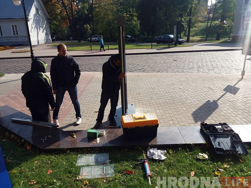 Новы інфармацыйны стэнд на вуліцы Ажэшкі і тыдня не прастаяў спакойна: у выходныя невядомыя выбілі адзін з элементаў. Імаверна, ударам нагі.