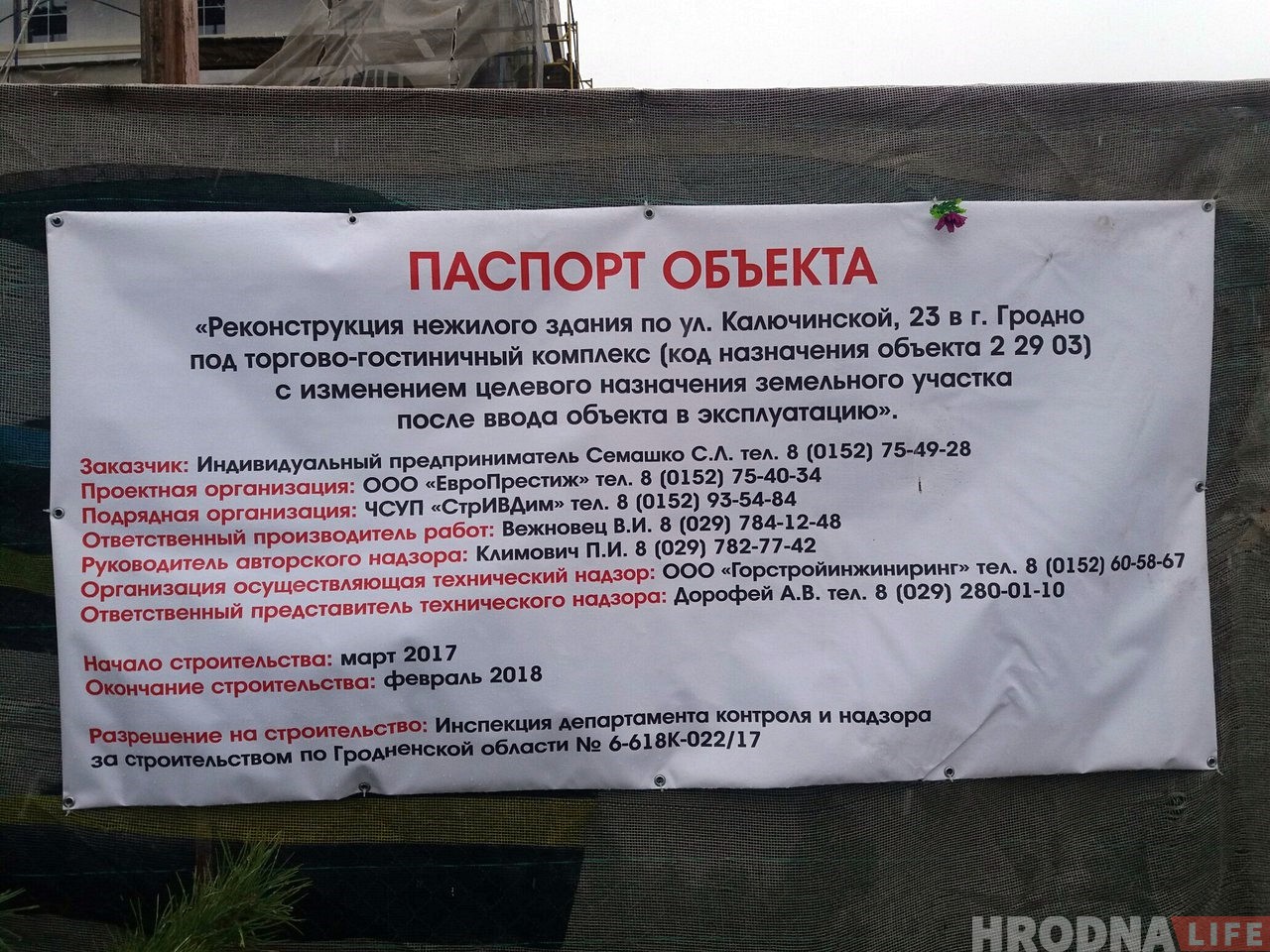 Пасля вымушанага перапынку працягнулася рэканструкцыя камяніцы па вуліцы Калючынскай, 23, уладальнікам якой з’яўляецца бізнесмен Станіслаў Сямашка. На аб’екце з’явіўся новы пашпарт, згодна з якім закончыць працы плануецца ў лютым 2018 года.