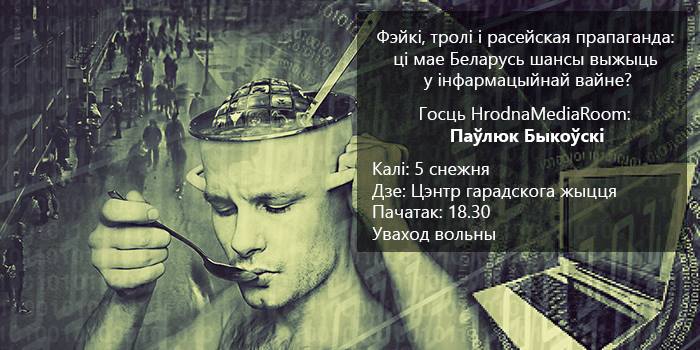 Фэйкі, тролі і расейская прапаганда – ці мае Беларусь шанцы выжыць у інфармацыйнай вайне? Пра гэта можна будзе паразмаўляць з госцем HrodnaMediaRoom, вядомым беларускім медыяэкспертам Паўлюком Быкоўскім.