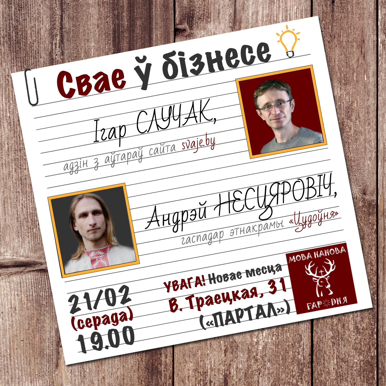 Першыя заняткі ў новым месцы пройдуць 21 лютага і будуць прысвечаны беларускаму бізнесу і святкаванню Дня роднай мовы. Пра тое, як гэта – весці бізнес па-беларуску, раскажа Андрэй Несцяровіч, уласнік “Цудоўні”, гандлёва-культурніцкай прасторы, дзе можна знайсці рэчы ў нацыянальным стылі і кнігі па-беларуску, а па вечарах — трапіць на цікавую імпрэзу.