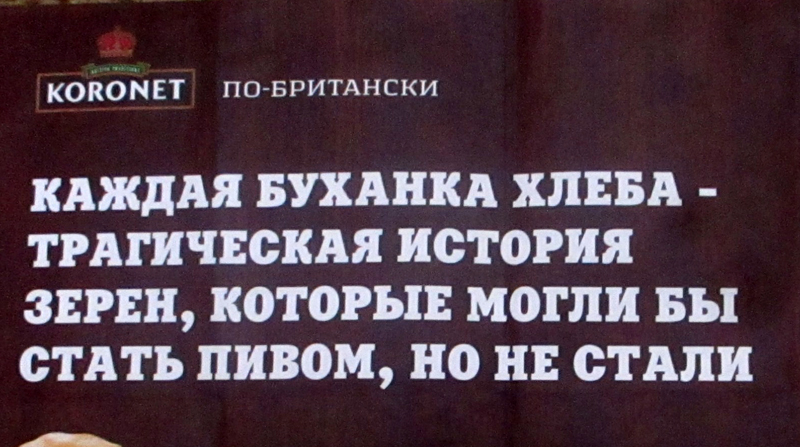 «Кожная баханка хлеба – трагічная гісторыя зерня, якое магло б стаць півам, але не стала», – так даслоўна абвяшчае гэты надпіс. На нашу думку, гэта выказванне проста абразліва ў гістарычным і маральным сэнсах для славянскіх народаў.