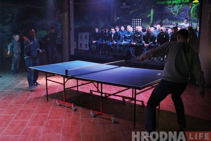 Нападнікі “Нёмана” Леанід Ковель і Мікалай Януш гуляюць у настольны футбол супраць заўзятараў каманды
