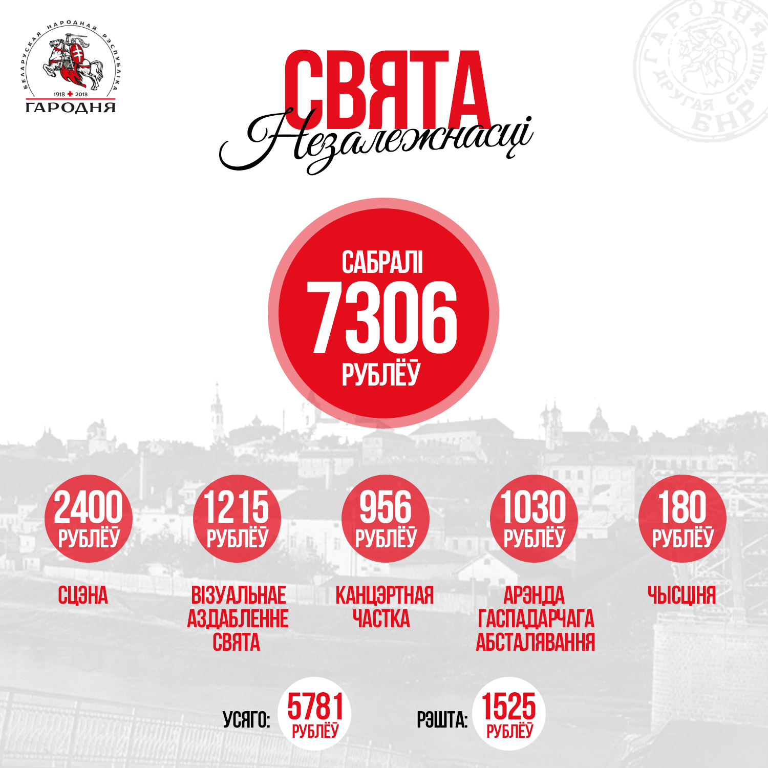 На дазволенае святкаванне 100-гадовага юбілею БНР збіралі грошы праз краўдфандынг. Гарадскія ўлады забяспечылі ахову і медычнае абслугоўванне. Арганізатары падзяліліся інфармацыяй, якая сума была сабраная, як яна патрачаная і на што пойдуць нявыкарыстаныя сродкі.