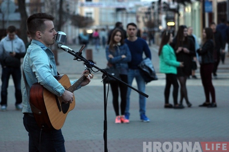 Увечары 15 красавіка мінскі вулічны музыка Максім Сакалоў зладзіў на Савецкай плошчы ў Гродне самы сапраўдны канцэрт. Артыст тры гадзіны спяваў на розных мовах і сабраў шмат слухачоў.
