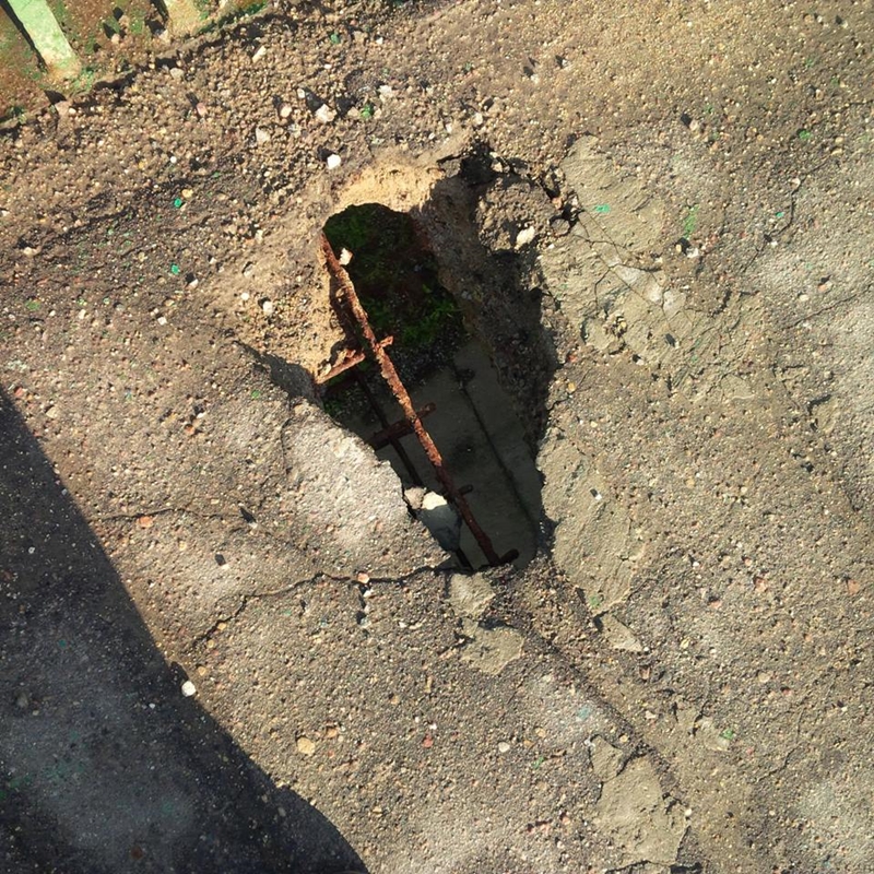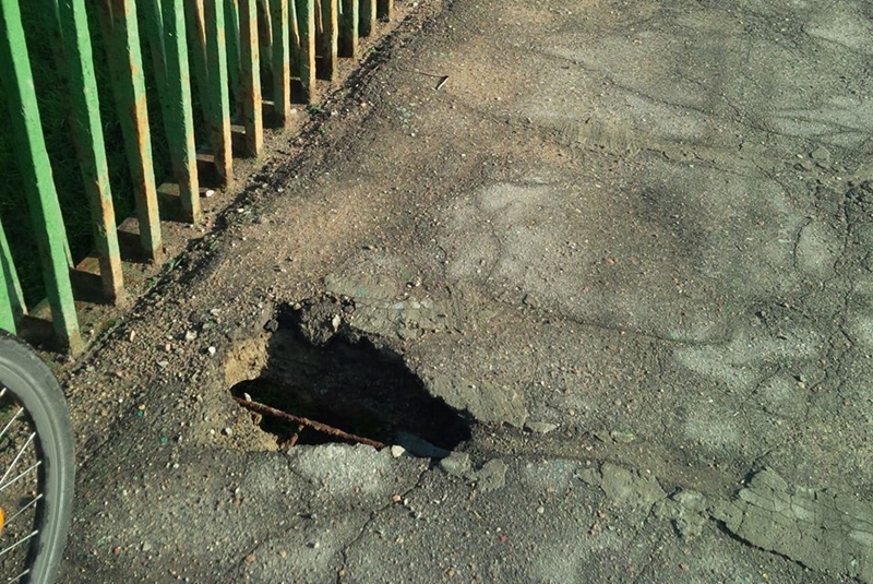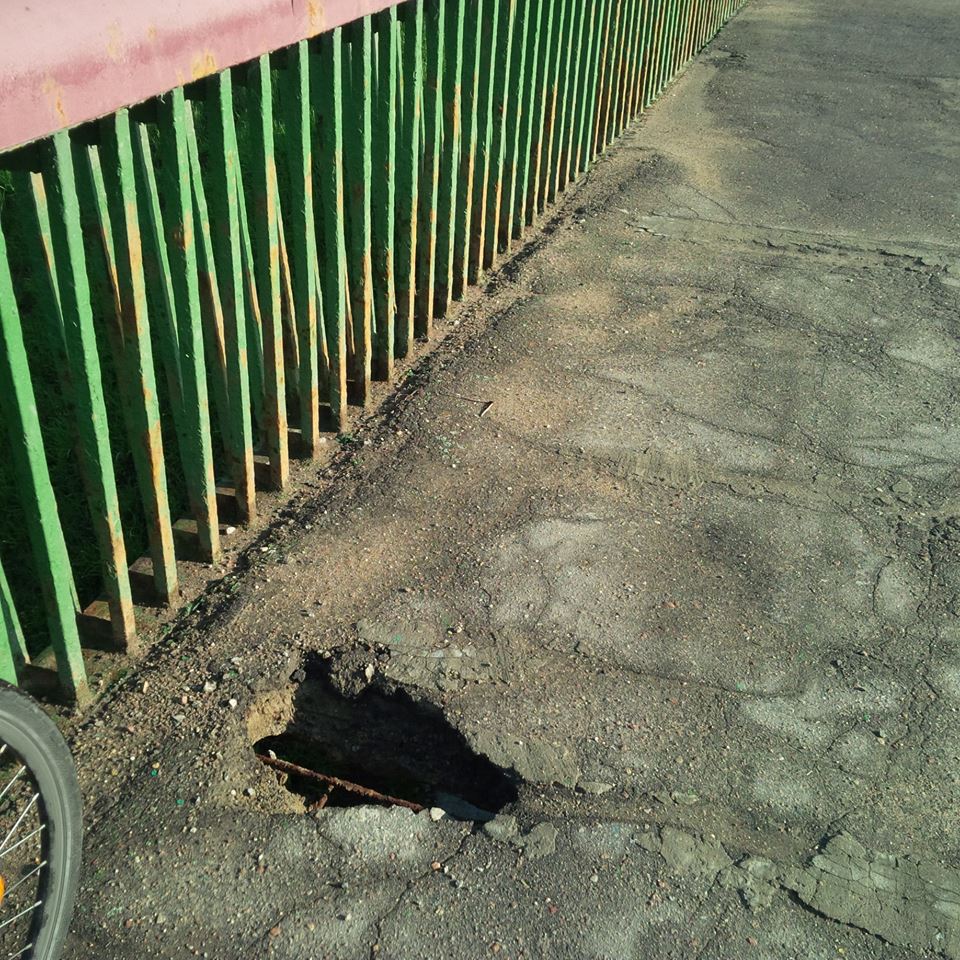 “Саму дзірку я не вымярала, бо спяшалася на працу. Але раварыст на хуткасці лёгка ўляціць у тую дзірку, ды навярнуцца можа, – распавядае раварыстка. – Там пастаянна нешта адвальваецца, як кажуць камунальнікі. Проста раней то з-пад моста было, а тут ужо да саміх ходнікаў дайшло. Як яшчэ палатно дарогі не правальваецца? Загадка. Дзірка можа не самая вялікая, але мост страсае нават ад невялікай грузавой машыны. Пакуль я рабіла фоты, праехала некалькі машын, дык страшна стаяць было побач”.