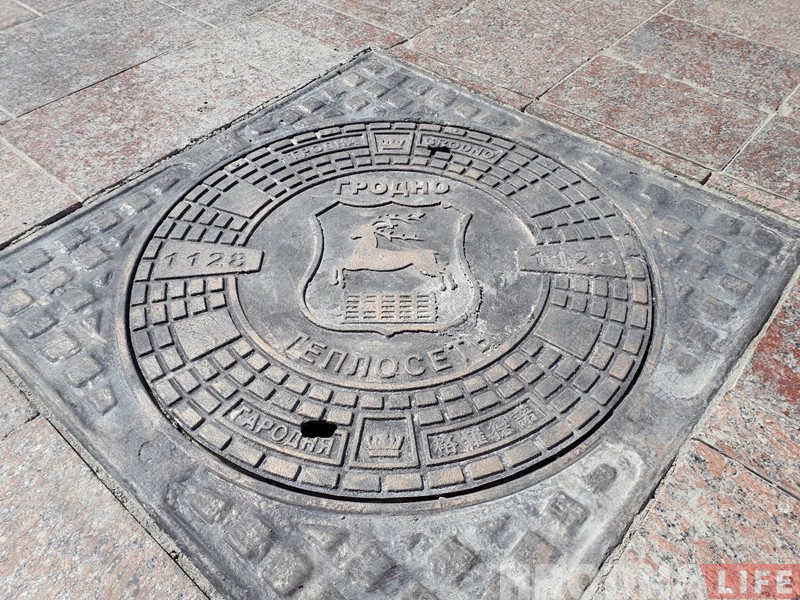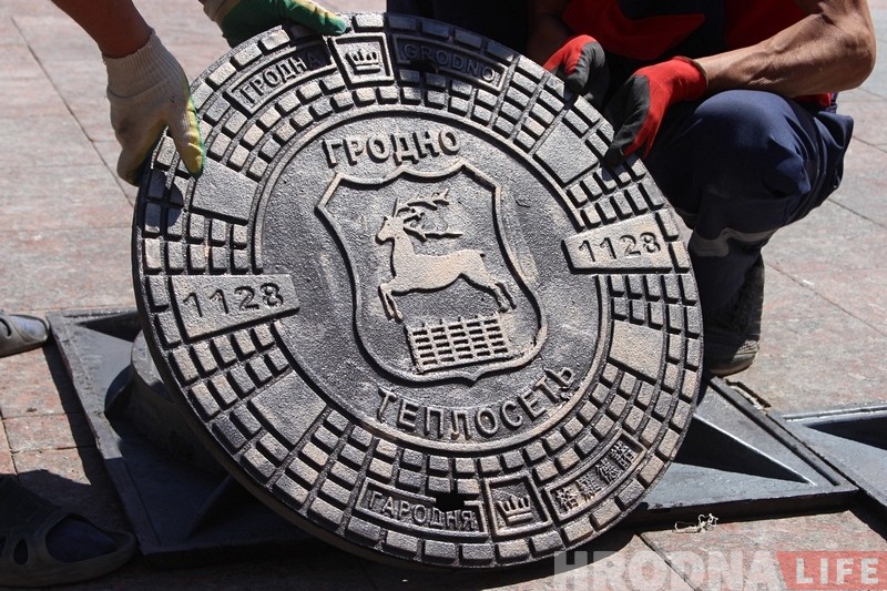 Новыя люкі з гербам Гродна, годам заснавання і назвай горада на чатырох мовах. Таксама маецца надпіс «Теплосеть».