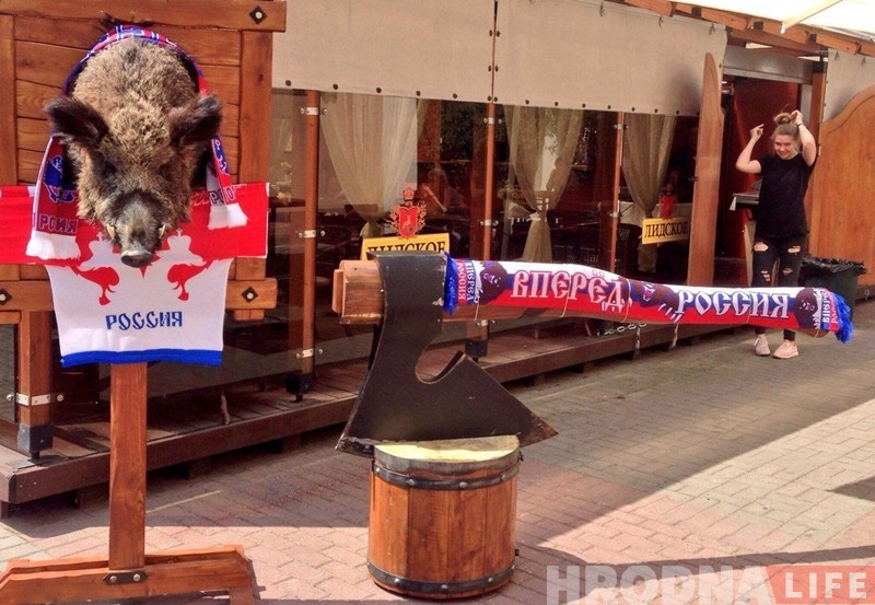 У вулічным кафэ “Губерня” на вуліцы Савецкай невядомыя скралі сцяг Расіі, а моцны вецер скінуў пудзіла дзіка-фаната, якое прыйшлося рэстаўраваць. Сцяг і пудзіла былі выстаўленыя, бо кафэ – папулярнае месца для прагляду матчаў чэмпіянату свету па футболе.