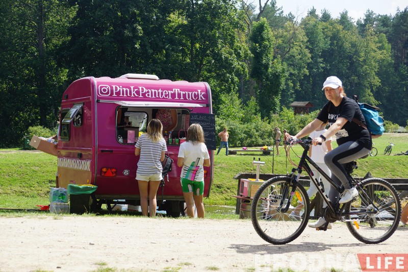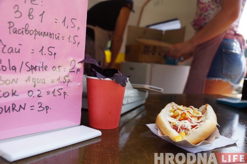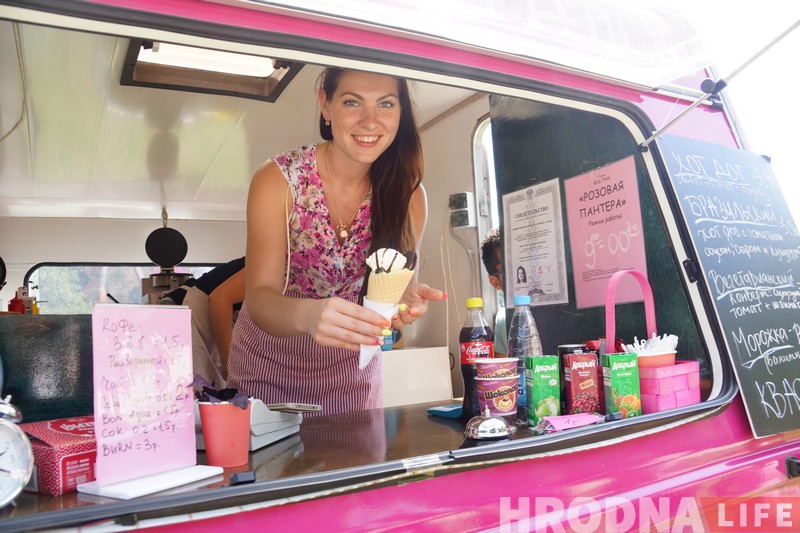 Зараз ружовы фудтрак прапануе наведвальнікам хот-догі, канверцікі з начыннем, марозіва і розныя напоі – тое, што не трэба доўга чакаць і можна ўзяць з сабой.