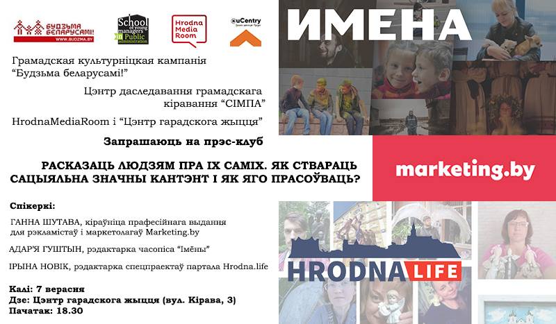 Пра тое, як журналісты ствараюць і прасоўваюць матэрыялы, важныя для людзей, раскажуць на сустрэчы ў прэс-клубе, які пройдзе ў Гродне 7 верасня. Экспертамі будуць Ганна Шутава, кіраўніца прафесійнага выдання для рэкламістаў і маркетолагаў Marketing.by, Адар’я Гуштын, рэдактарка часопіса “Імёны”, Ірына Новік, рэдактарка спецпраектаў Hrodna.life.