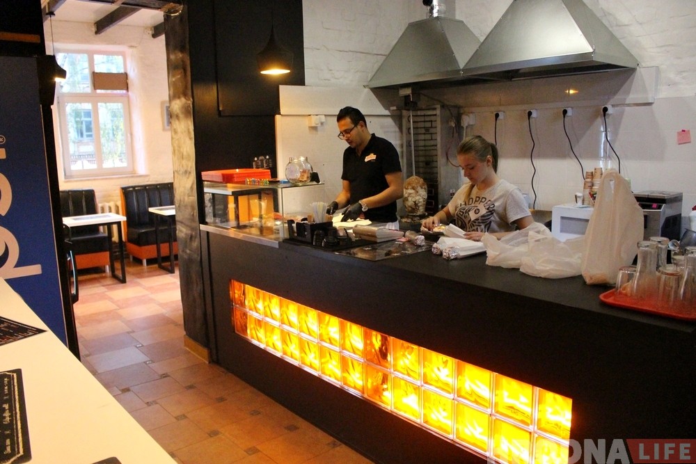Новае кафэ разлічана на 13 пасадачных месцаў. Шаўрма (400 г) абыйдзецца ў 5,99 руб, а кава амерыкана ў 1,69 руб.