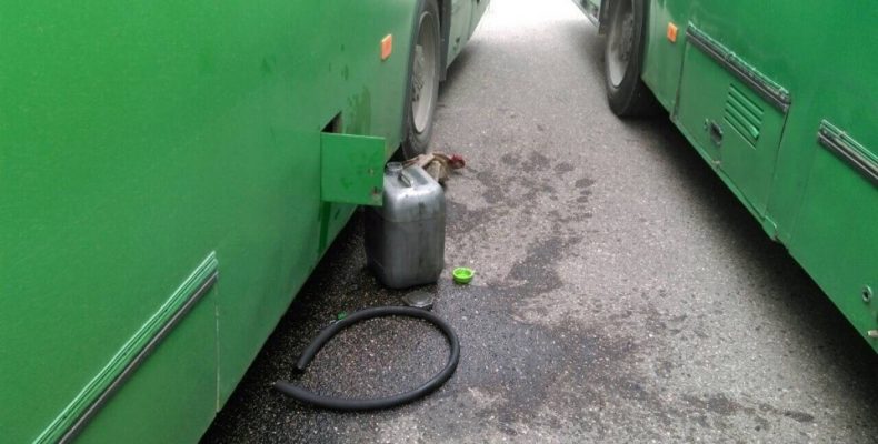 Чатыры машыны стаялі квадратам так, каб прыкрываць адно аднаму паліўныя гарлавіны. Праваахоўнікі падышлі бліжэй і выявілі, што з аднаго з аўтобусаў якраз зліваюць «салярку». Каністру ўжо паспелі напоўніць 12-ю літрамі дызеля, у астатніх аўтобусах таксама выяўленыя ёмістасці з рэшткамі паліва і свежавыкарыстаныя шлангі.