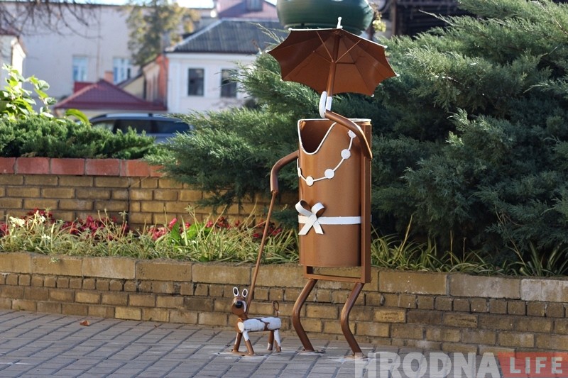 У цэнтры Гродна да канца тыдня з’явіцца шэсць сметніц у выглядзе “дамы з сабачкай” і дзве ў выглядзе “дворніка”.