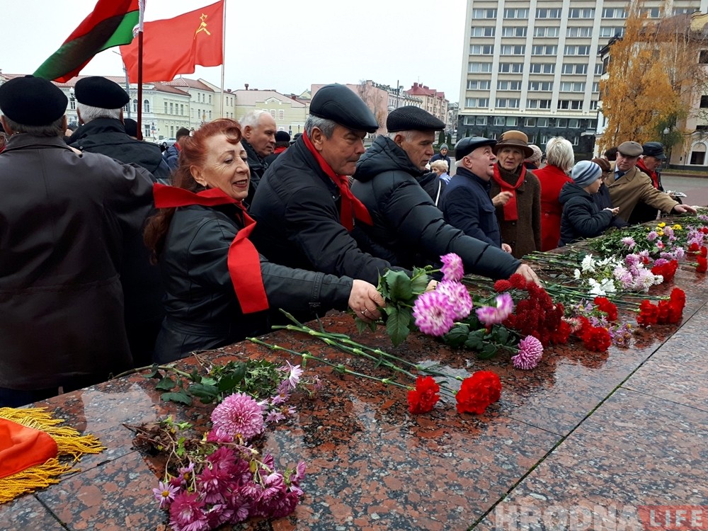 Каля 50 чалавек сабраліся ранiцай 7 лістапада на плошчы Леніна ў Гродне, каб адзначыць 101-ю гадавіну Кастрычніцкай рэвалюцыі. Мясцовыя камуністы ў гэты дзень па-традыцыі зладзілі мітынг, прынялі новых чальцоў і ўсклалі кветкі ля помніка свайму правадыру.