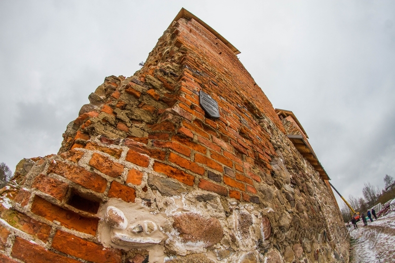 – Сцяна таўшчынёй 2,4 метра, у вышыню – амаль 10. Унутраны бок яе – бутавы камень, звонку – камень і паласа цэглы. Іх спалучалі і нашы продкі, што добра відаць у тым ліку на Княжацкай вежы. Клалі мы гэтак жа, як і шмат стагоддзяў таму: дзве вярсты, а паміж імі ідзе забутоўка, – растлумачыў Уладзімір Змушко.