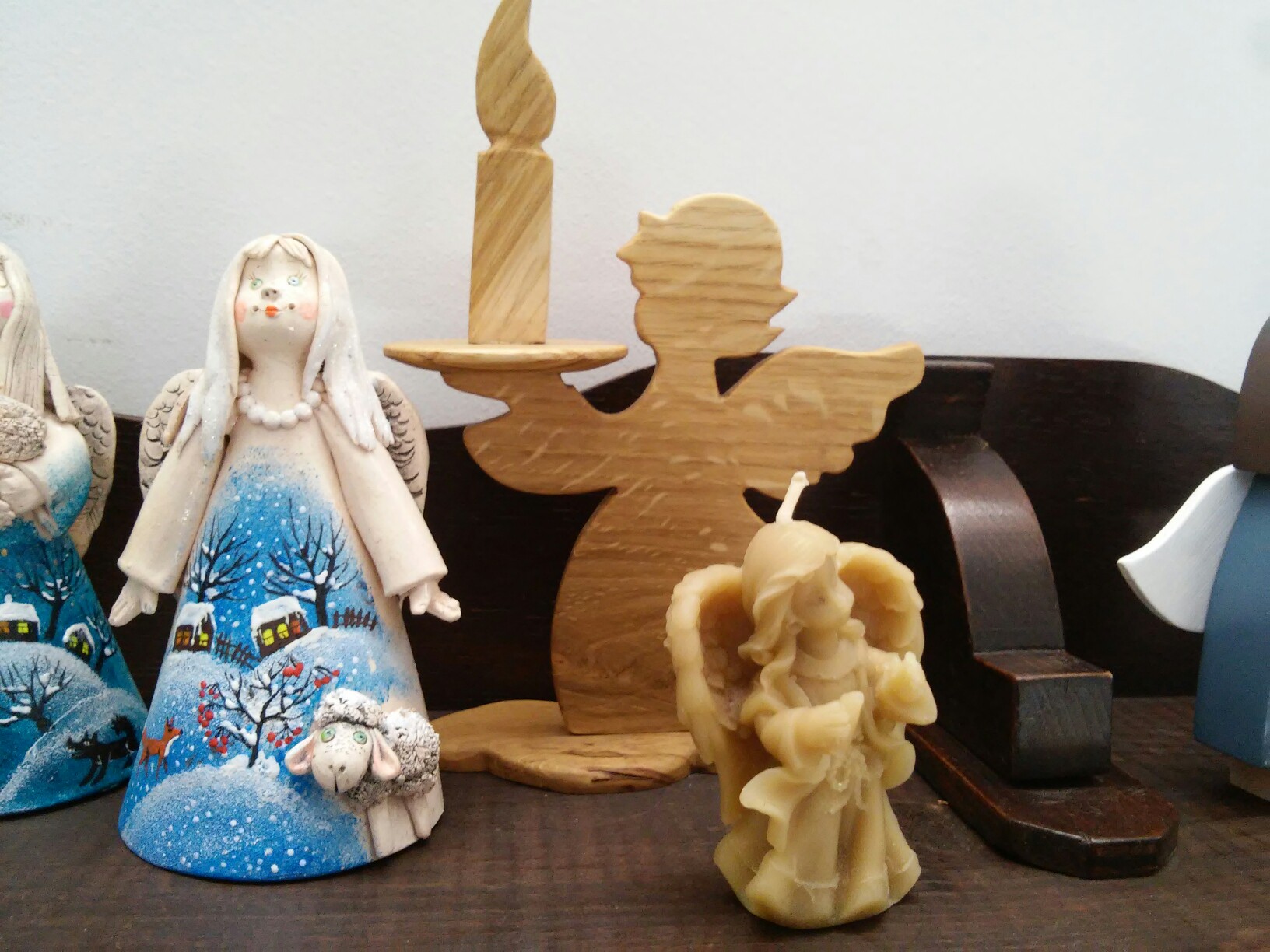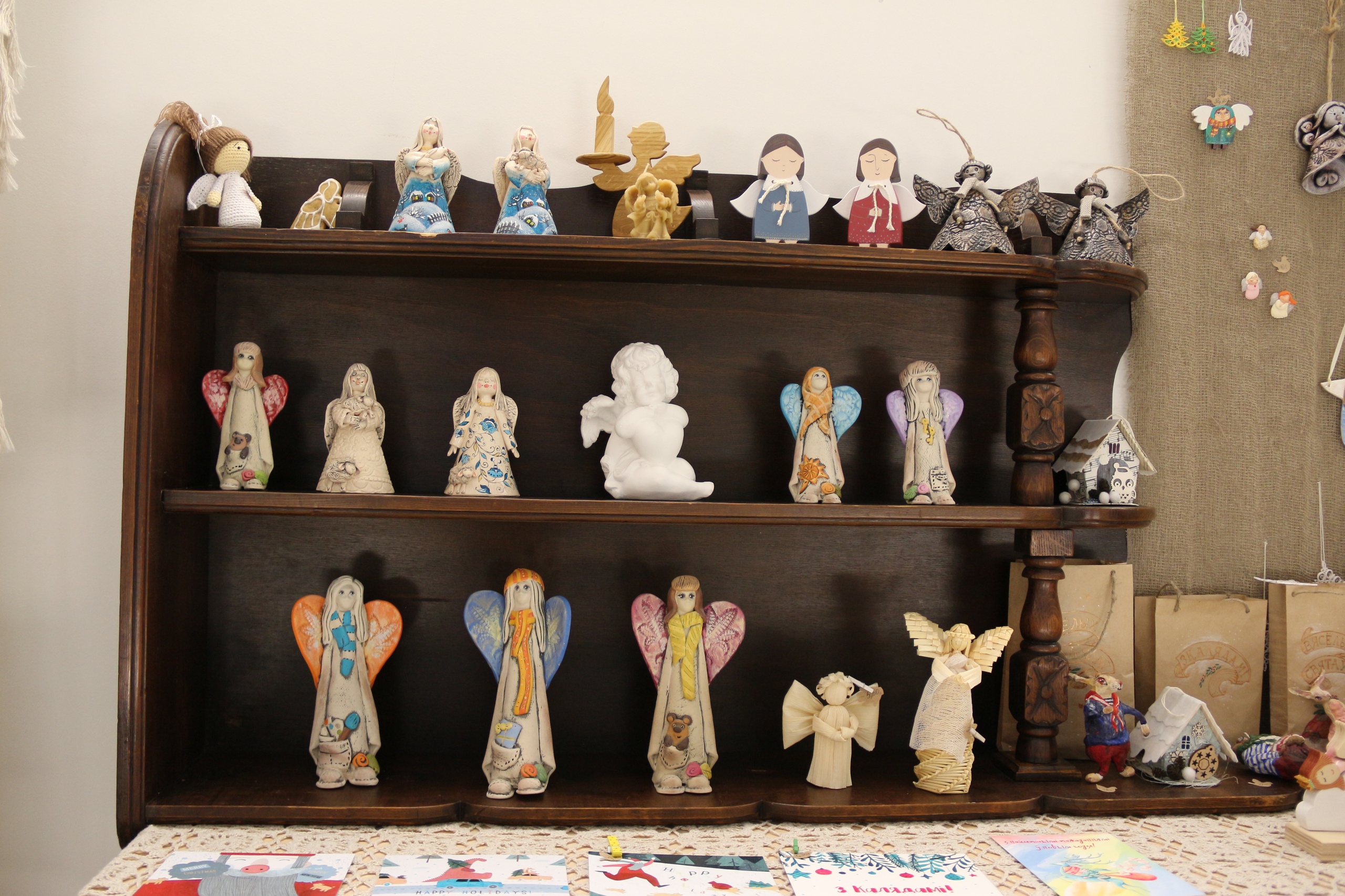 “Ідэя была сабраць выставу анёлкаў, вырабленых рознымі майстрамі. Тэма анёлаў блізкая многім мастакам, і заўсёды кранае нашыя сэрцы, асабліва ў калядны час”, – каментуе Дар’я Фядотава, гаспадыня крамы “Лёля”.
