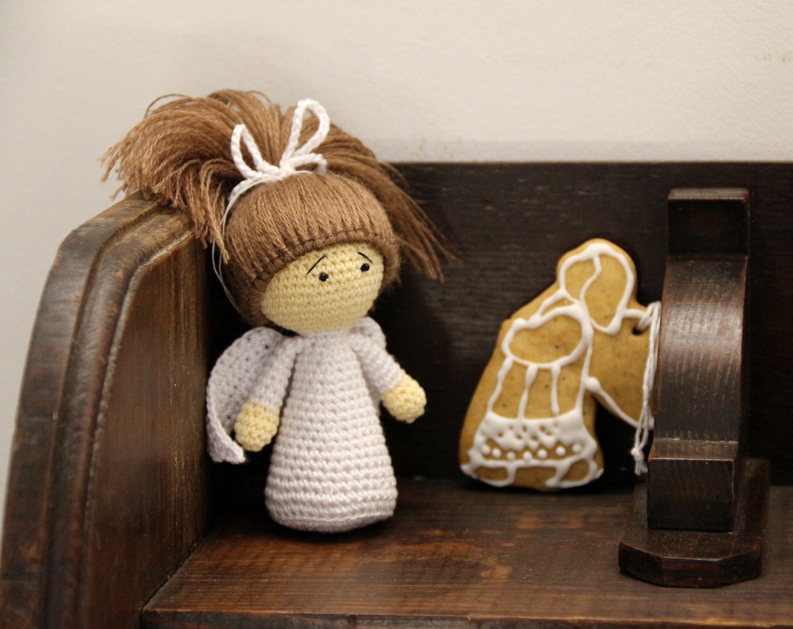На выставе – анёлкі ад розных гродзенскіх майстроў і мастакоў з іншых гарадоў Беларусі. Ёсць саламяныя, драўляныя і нават анёлкі-пернічкі, міні-анёлачкі. У куце стаіць святочная ялінка, завешаная навагоднімі цацкамі ручной работы.