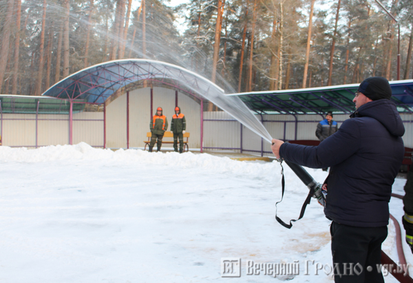Работнікі «Гродназелянбуда» пачысцілі пляцоўку і насыпалі снежныя борцікі, «Водаканал» падключыў ваду, а затым пачалося заліванне лёду. Каля двух гадзін спатрэбілася, каб завяршыць першы этап залівання. Як толькі лёд падмерзне, пачнуць заліваць другі пласт, а заўтра раніцай трэці – пласт лёду.