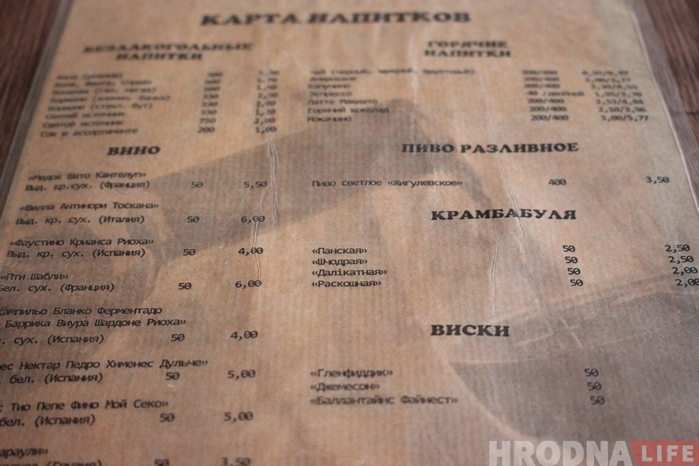 Таксама ў кафэ ёсць вялікі выбар розных напояў, у тым ліку і алкаголю, асноўным з’яўляецца беларуская крамбамбуля. У будучыні ва ўстанове з’явяцца сняданкі і новыя стравы.