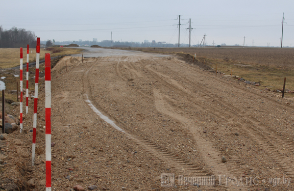 Цяпер на ўчастку даўжынёй каля 60 метраў ўсталявалі разметку калкамі і насыпалі пласт грунту.