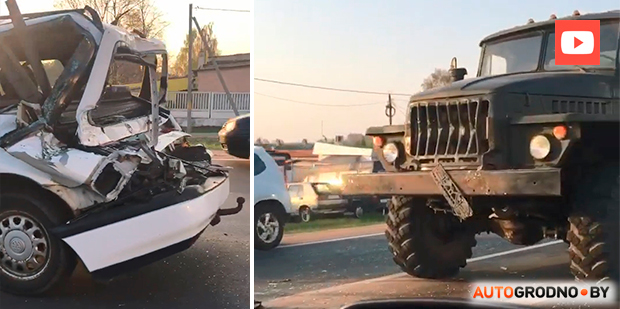 На вуліцы Суворава каля 21:00 26 красавіка Урал з вайсковай часці урэзаўся ў спадарожны VW Passat B4. Ударам грузавік змяў заднюю частку ўніверсала да самых дзвярэй і адкінуў легкавік на метраў 40 наперад. Чытач АвтоГродно падзяліўся відэазапісам нетыповага ДТЗ.