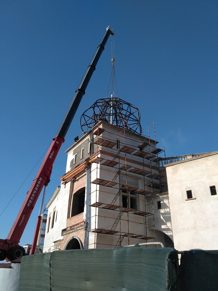Раніцай 7 кастрычніка на ўязную вежу Старога замка прымерылі каркас будучага купала. Ён будзе пакрыты канструкцыяй з кратамі, а зверху – луджанай меддзю.