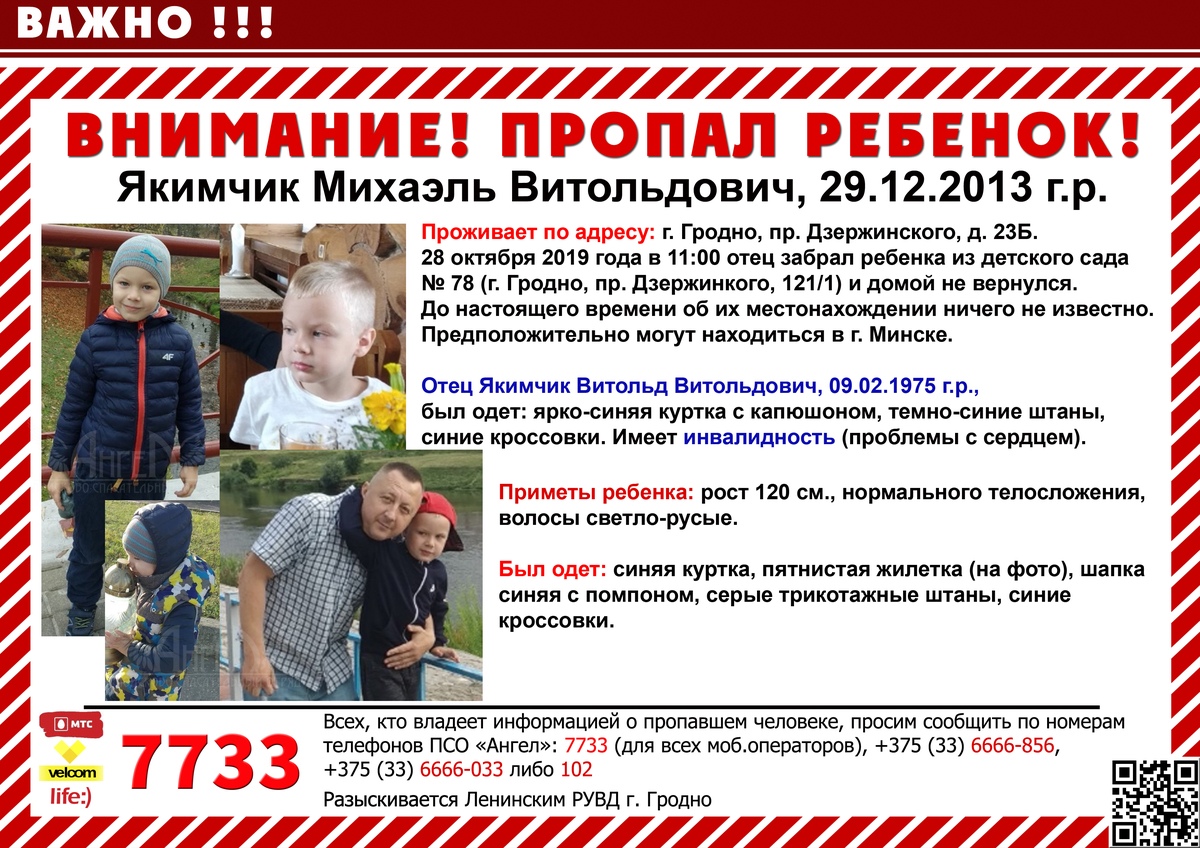 Нагадаем, 28 кастрычніка каля 11 гадзін дня дзіця з дзіцячага садка №78, што на праспекце Дзяржынскага, 121/1, забраў і павёў у невядомым накірунку яго бацька Вітольд Якімчык. Дадому яны так і не вярнуліся. Відавочных зачэпак пра месцазнаходжанне мужчыны і дзіцяці таксама няма. Яны могуць знаходзіцца ў любым пункце краіны. Родныя хвалююцца яшчэ і таму, што хлопчык застаўся з бацькам, у якога праблемы з сэрцам. Мужчына мае інваліднасць другой групы.