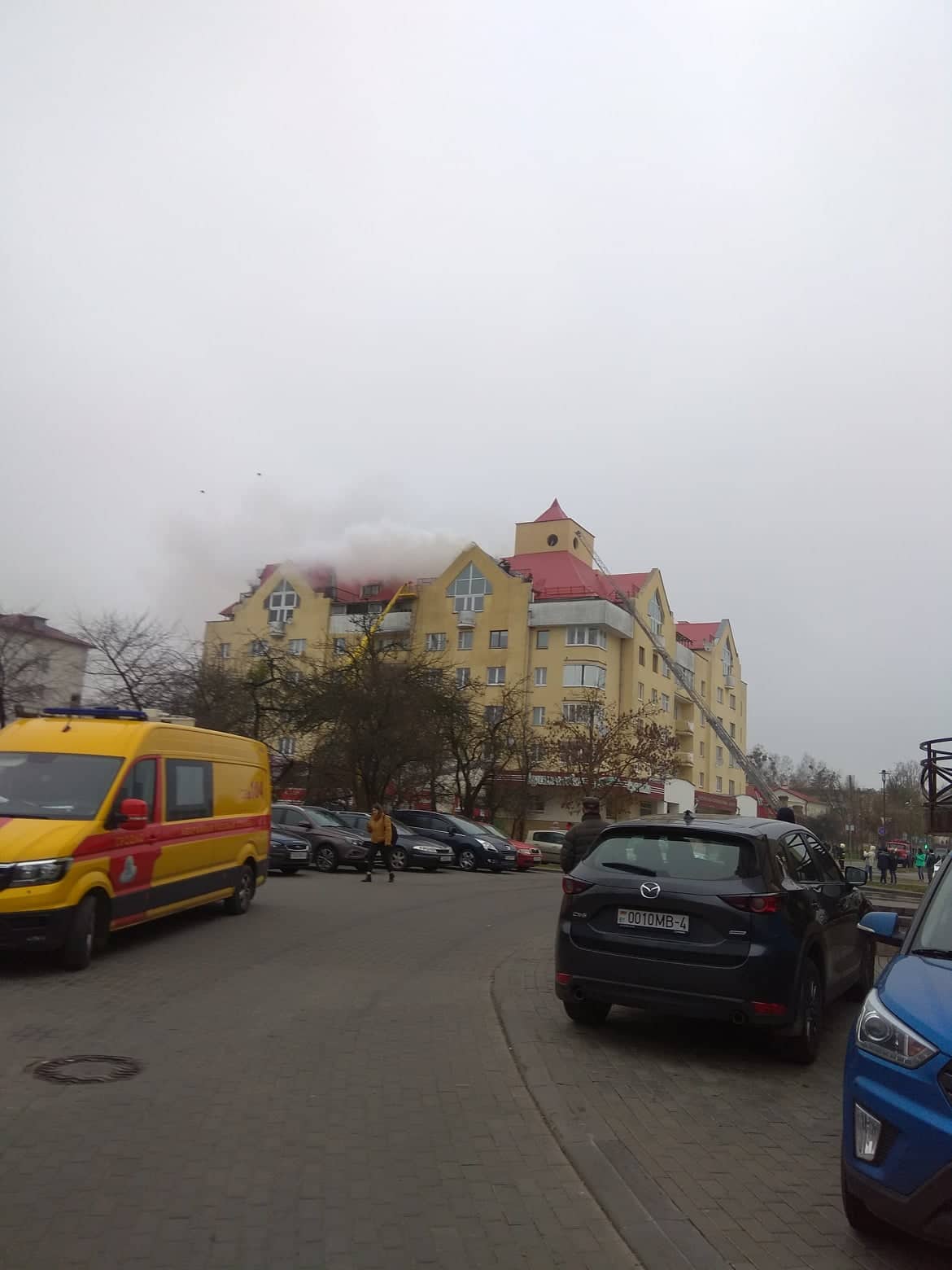 На вуліцы 1 Мая гарыць дах жылога будынка насупраць Еўраопта. Працуюць чатыры экіпажы пажарных, стаіць хуткая дапамога.