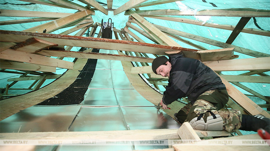 Майстар па даху Святаслаў Бурмейстар тлумачыць, што практычна ўсе работы выконваюцца ўручную. Так калісьці будавалі і нашы продкі, хоць цяпер выкарыстоўваюцца сучасныя падыходы і матэрыялы. Драўляны каркас купала абшываецца дахавай мембранай, затым грані пазначаюцца вяровачнай сеткай, сам ліст медзі замацоўваецца на патрэбным месцы толькі пасля дбайнай прымеркі.