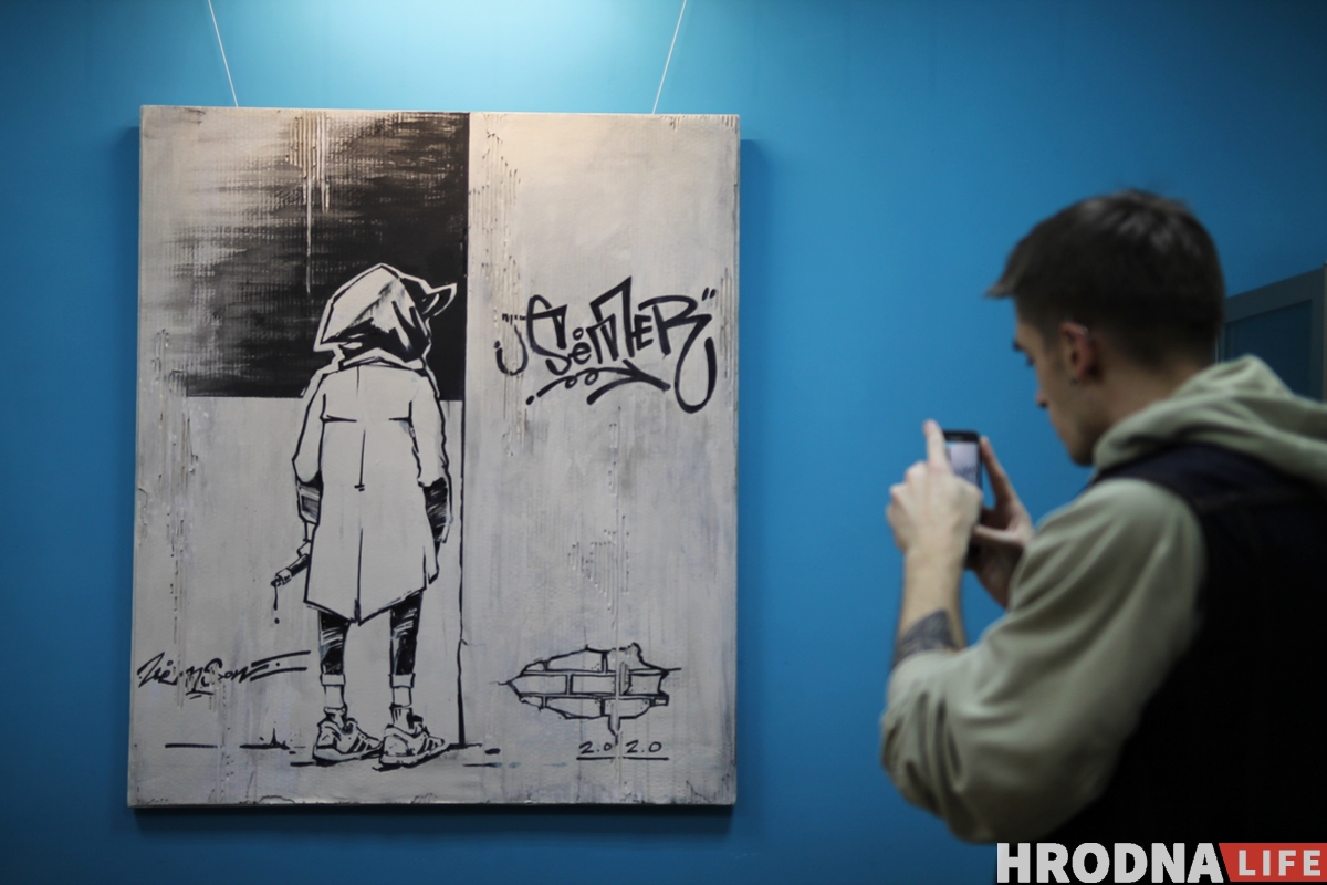 – У нас сёння незвычайная выстава, бо ў прасторы паказваецца вулічнае мастацтва. Гэтак жа незвычайна і прыемна, што гэта дэбютная выстава Аляксандра Крыпака. З чым мы яго віншуем , – кажа Кацярына Петруцый, арганізатарка выставы.
