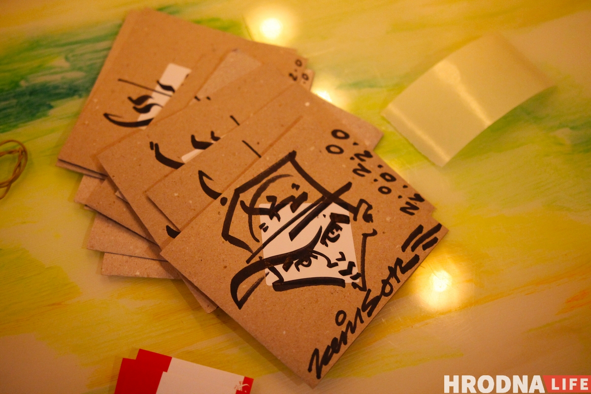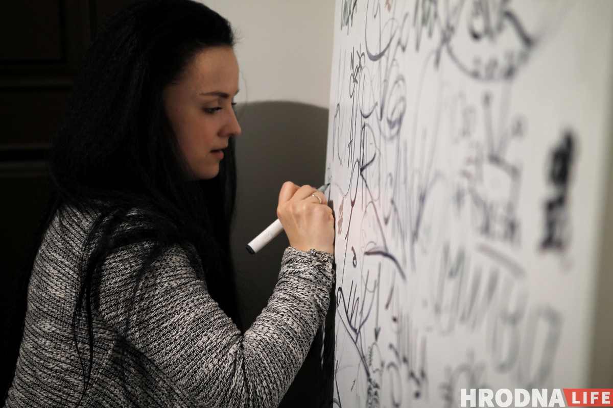 На адкрыцці выставы вырашылі дадаць інтэрактыву. Кожны мог узяць налепкі-стыкеры, напісаць на іх сваё імя і прыляпіць. Альбо папрасіць мастака зрабіць стылізаваны надпіс. Так людзі маглі ведаць, як каго завууць, і стаць бліжэй адзін да аднаго.