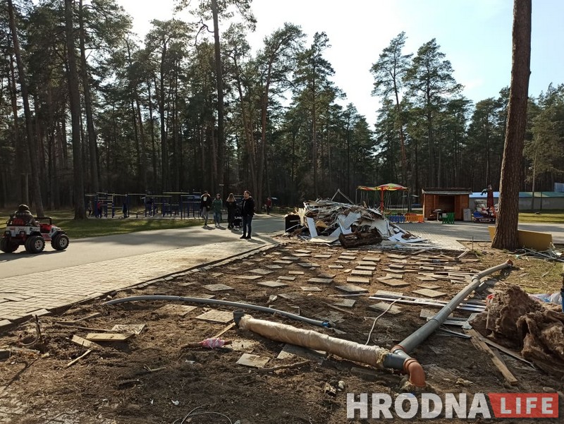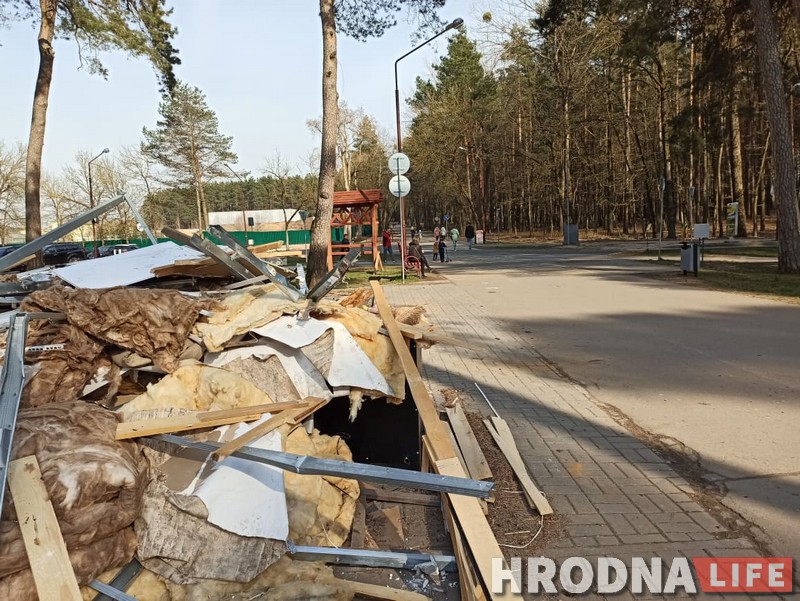 Кавярня на пачатку сцежкі здароўя існавала каля трох гадоў. Зараз яе знеслі. Тыя, гродзенцы, што прыйшлі на шпацыр у лесапарк 27 сакавіка, пабачылі на месцы павільёна толькі груду смецця на апусцелай пляцоўцы.