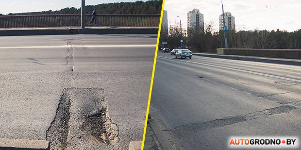 У кожным выпадку расколіны на асфальце розныя. Ад тых, толькі што якія з’явіліся, да расколін шырыней па 50 сантыметраў. Апошнія ўжо добра адчуваюцца падвескай, а на мосце чутны грукат.