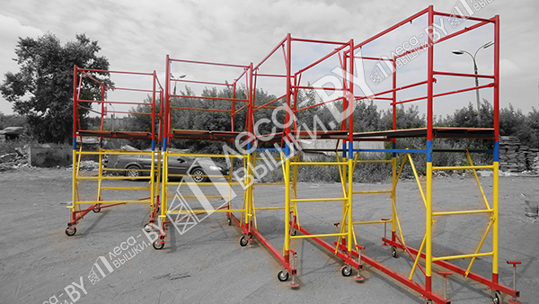 На Lesa-vyshki.by представлены строительные туры из высококачественного алюминия, окрашенного порошковой краской. Они легко собираются методом «труба в трубу». Каждая вышка имеет базовый блок и несколько дополнительных, от числа которых зависит высота вышки. Благодаря тому, что базовый блок оснащен колесами, вышкам обеспечена мобильность. Самая высокая из представленных на сайте моделей имеет высоту 20,7 метра (вес 456 кг, размер площадки 2х2 метра). Более низкие модели имеют меньший размер площадки. Все площадки, на которых работают строители, оснащены защитным ограждением. Деревянный настил рассчитан на нагрузку до 250 кг. До площадки рабочие понимаются по рамам-лестницам. Вышка может иметь несколько настилов для работы на разной высоте.