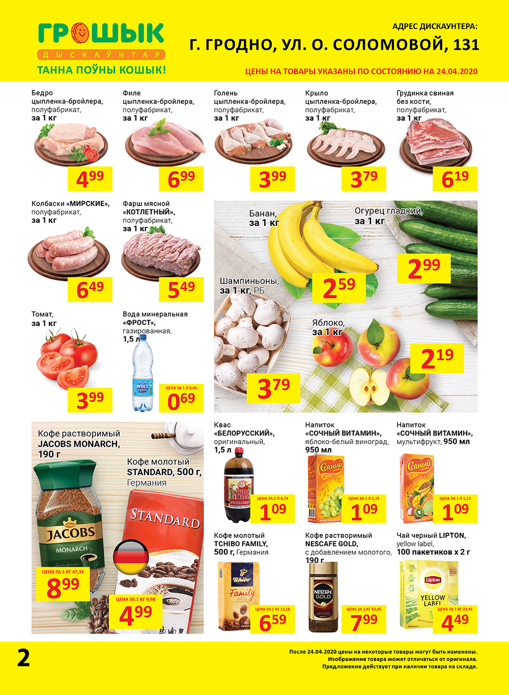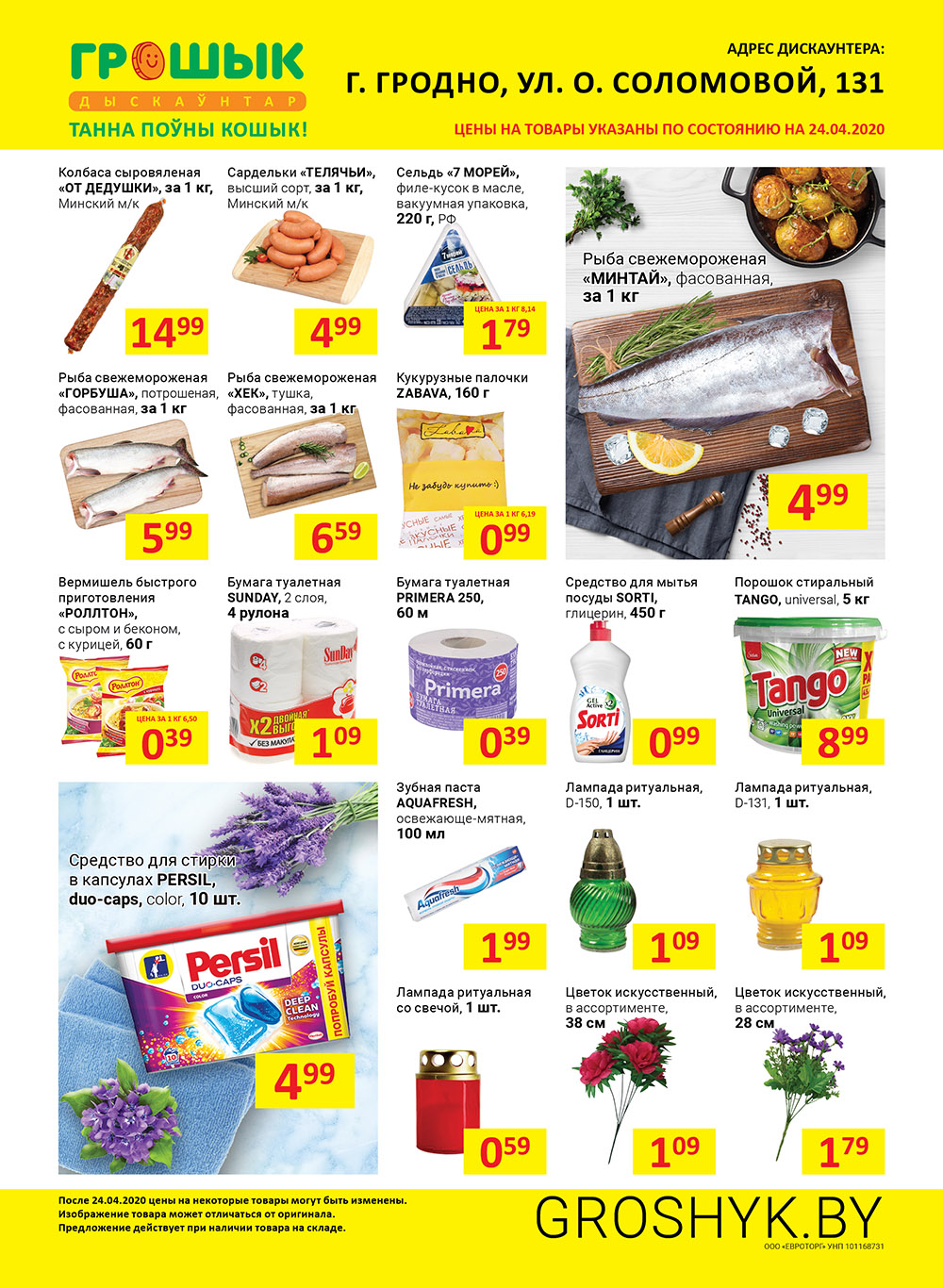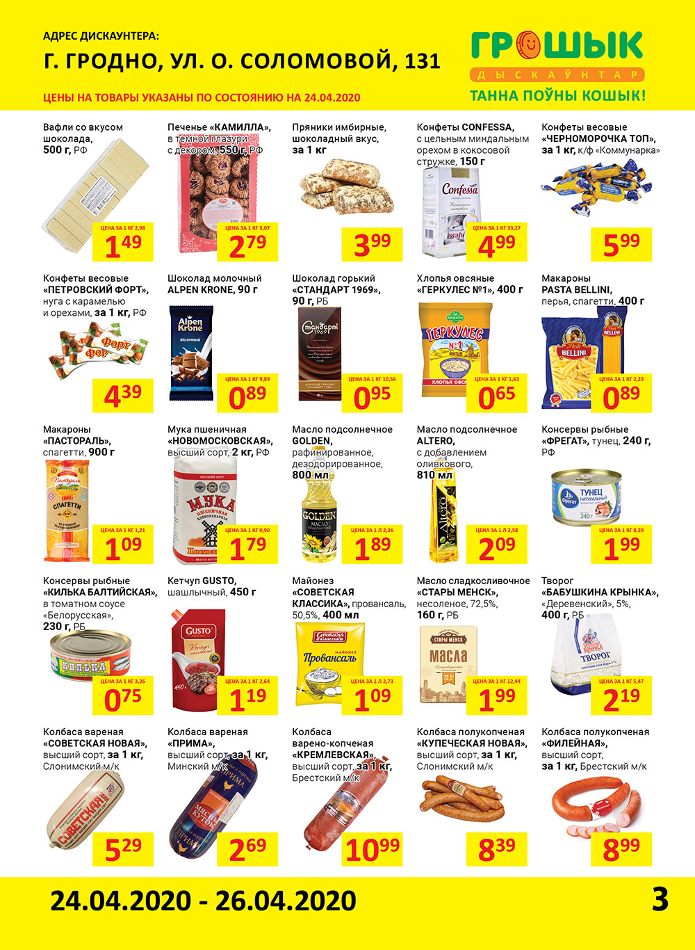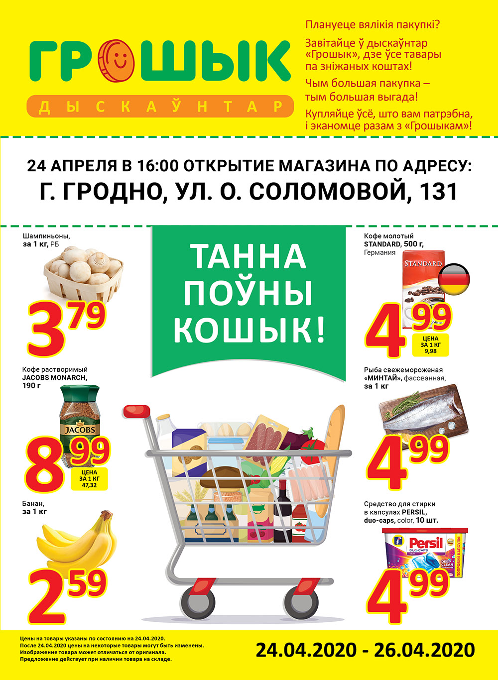 Адкрыццё дыскаўнтара «Грошык» адбудзецца 24 красавіка ў 16:00 па адрасе: вул. В. Соламавай, 131. Раней там быў “Евроопт”. Як абяцаюць, тут усе тавары будуць па знiжаных коштах.
