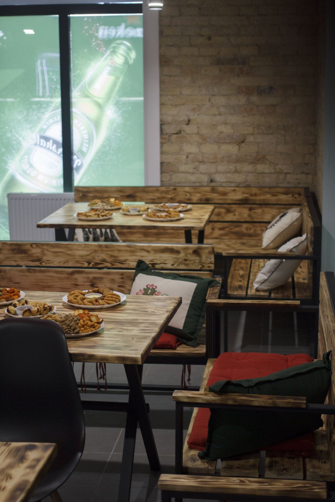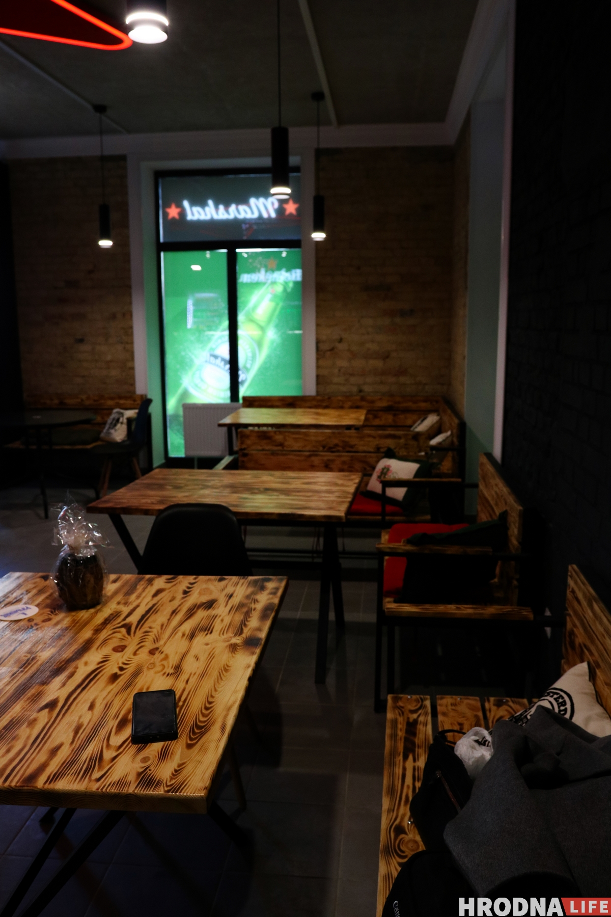 У бары будзе каля 60 пасадачных месцаў, з іх 30 – на летняй пляцоўцы. У памяшканні ёсць сталы як на два чалавекі, так і на вялікую кампанію, і дзве барныя стойкі.