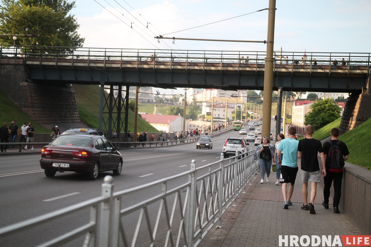 А 20:25 відавочцы паведамілі, што шлях на мост з боку Гарнавых перакрылі, людзям забараняюць стаяць на мосце. Машыны гучна сігналяць, на ходніку – супрацоўнікі АМАП, але людзі не расходзяцца.