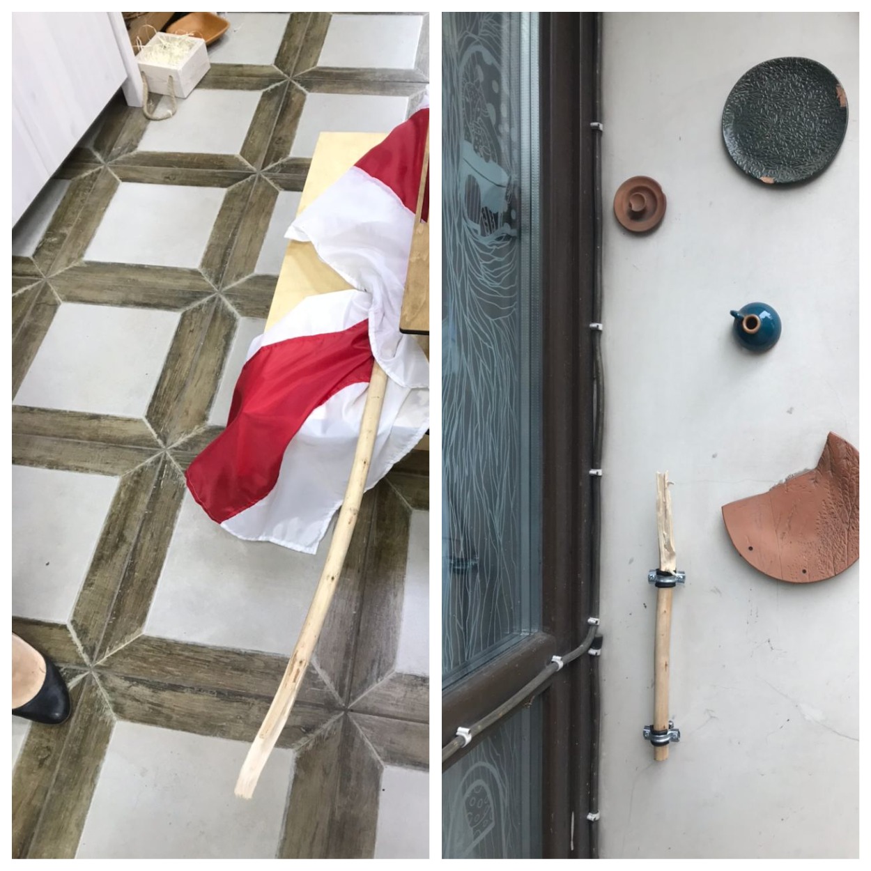 Каля 14.00 28 жніўня ўладальнік крамы “Цудоўня” Андрэй Несцяровіч убачыў, што двое незнаёмых яму людзей зламалі дрэўка, на якой вісіць бел-чырвона-белы сцяг, і кінулі яго на зямлю. Ён пайшоў за імі. Праз 50 метраў ён дагнаў невядомых і прыгразіў ім міліцыяй.